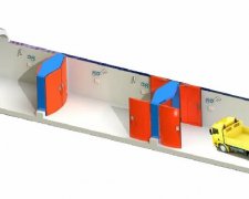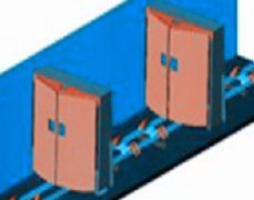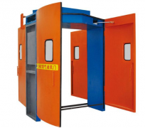 一套安全聯鎖減壓風門有四個反風門和四個正風門及2組框架結構的門框組成,頂部橫梁呈三角形結構,門扇與風壓流向成一定的夾角,把壓在門扇上的壓力分解一部分除去,減輕開閉門扇需要的力氣。門扇大部分要求表面為弧形增強抗壓性能,在門扇上有行人小門和觀察窗,單獨是行人通過時沒有必要把這么大的門扇都打開,只是從行人小門經過即可。